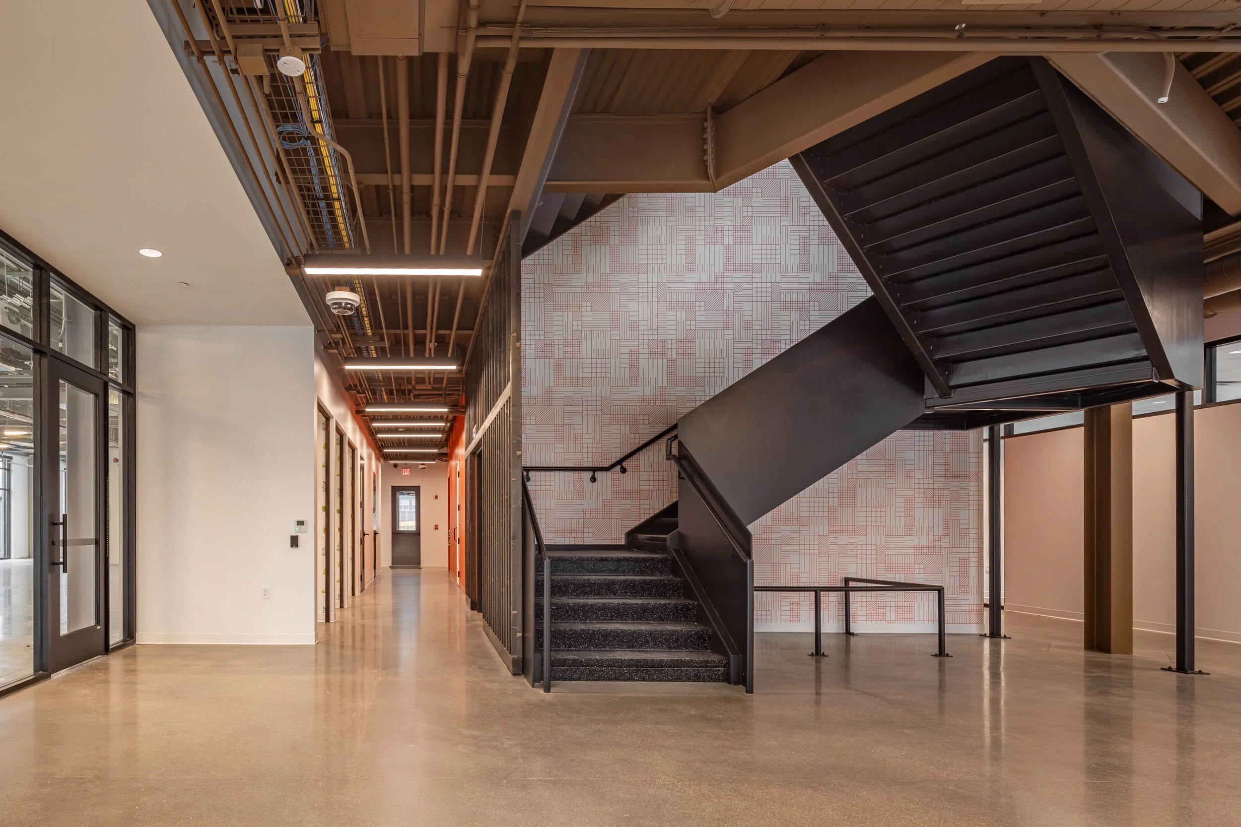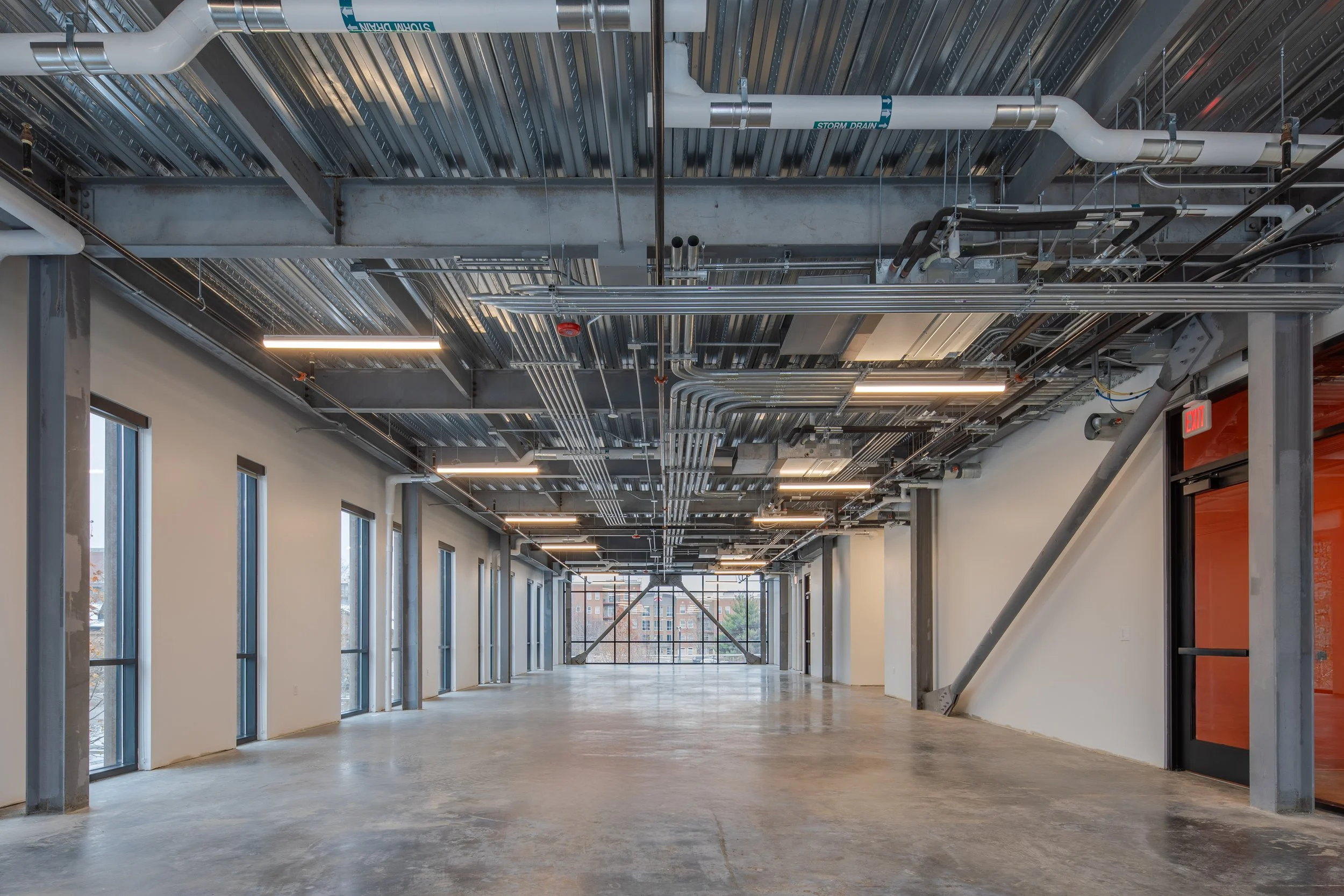 The Forge at the Trades District provides Class A office space available for tenant build-out. This building offers two floors of leasable space, complemented by a partial third-floor penthouse reception area that opens onto a rooftop terrace featuring a vegetative roof system. The design layout fosters an environment tailored to tech companies, supported by a programmatic framework designed to promote growth through collaboration. This approach aims to enhance brand identity, services, and products within the tech startup community.